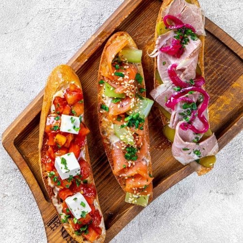багет, помидоры, сыр греческий, буженина, корнишоны, форель слабой соли, огурцы, кунжут