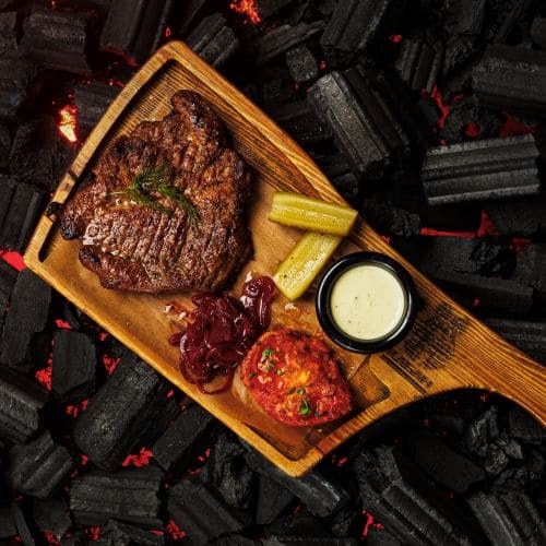 свиная шейка, корнишоны, помидоры, лук красный маринованный, зелень, соус чесночный