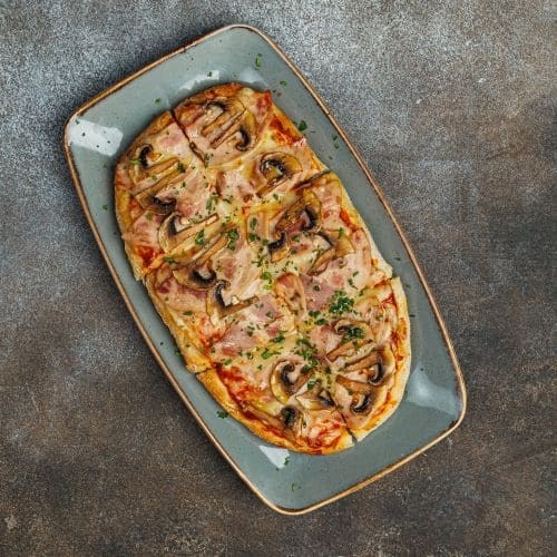 тесто, соус сырно-чесночный, сыр моцарелла, бекон, лук красный, зелень