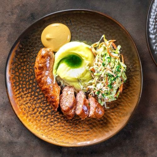 мясо курицы и свинины, зелень, картофельное пюре, салат коул-слоу, зелёное масло, соус горчичный