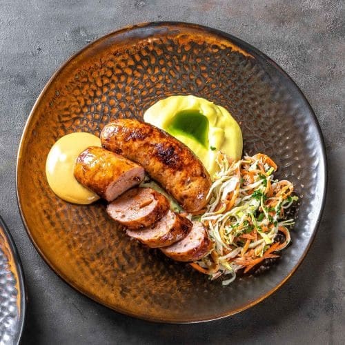 свинина с томатными гранулами, зелень, картофельное пюре, салат коул-слоу, зелёное масло, соус горчичный