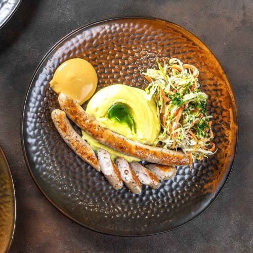 мясо курицы и свинины, с сыром сулугуни, зелень, картофельное пюре, салат коул-слоу, зелёное масло, соус горчичный
