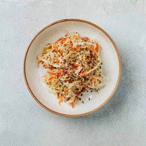 капуста, морковь, лук, сметана, майонез, горчица, кунжут, семена льна, зелень