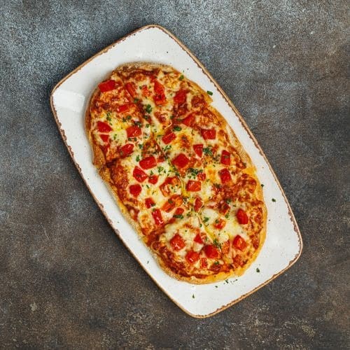 тесто, соус томатный, сыр моцарелла, помидоры, зелень