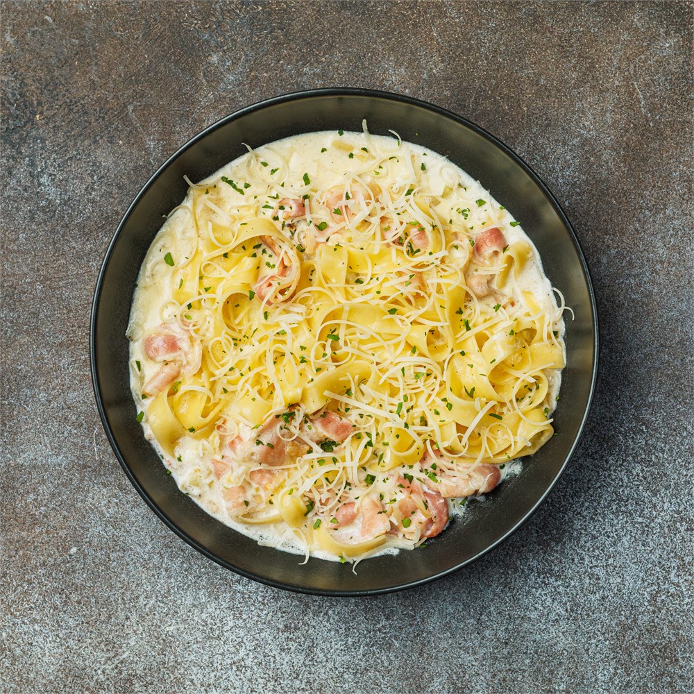 паста феттучини, бекон, сыр пармезан, сливки, лук, зелень
