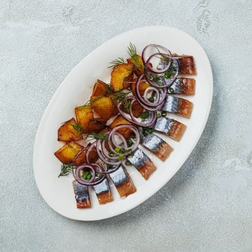 сельдь, картофель, лук красный, чесночное масло, зелень
