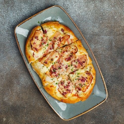 тесто, соус томатный, сыр моцарелла, ветчина, шампиньоны, зелень