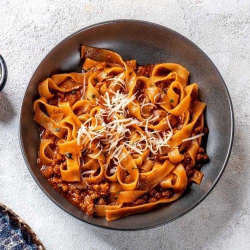 паста феттучини, фарш из мяса свинины и говядины, помидоры, сыр пармезан, лук, зелень