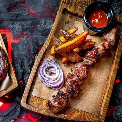 свиная шейка, лук красный, картофельные дольки, кунжут, зелень, перечный соус