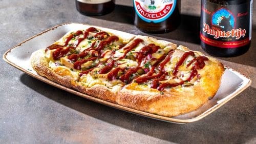 тесто, соус сырно-чесночный, соус барбекю, сыр моцарелла, корнишоны, куриное филе, лук красный, зелень