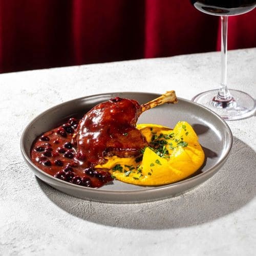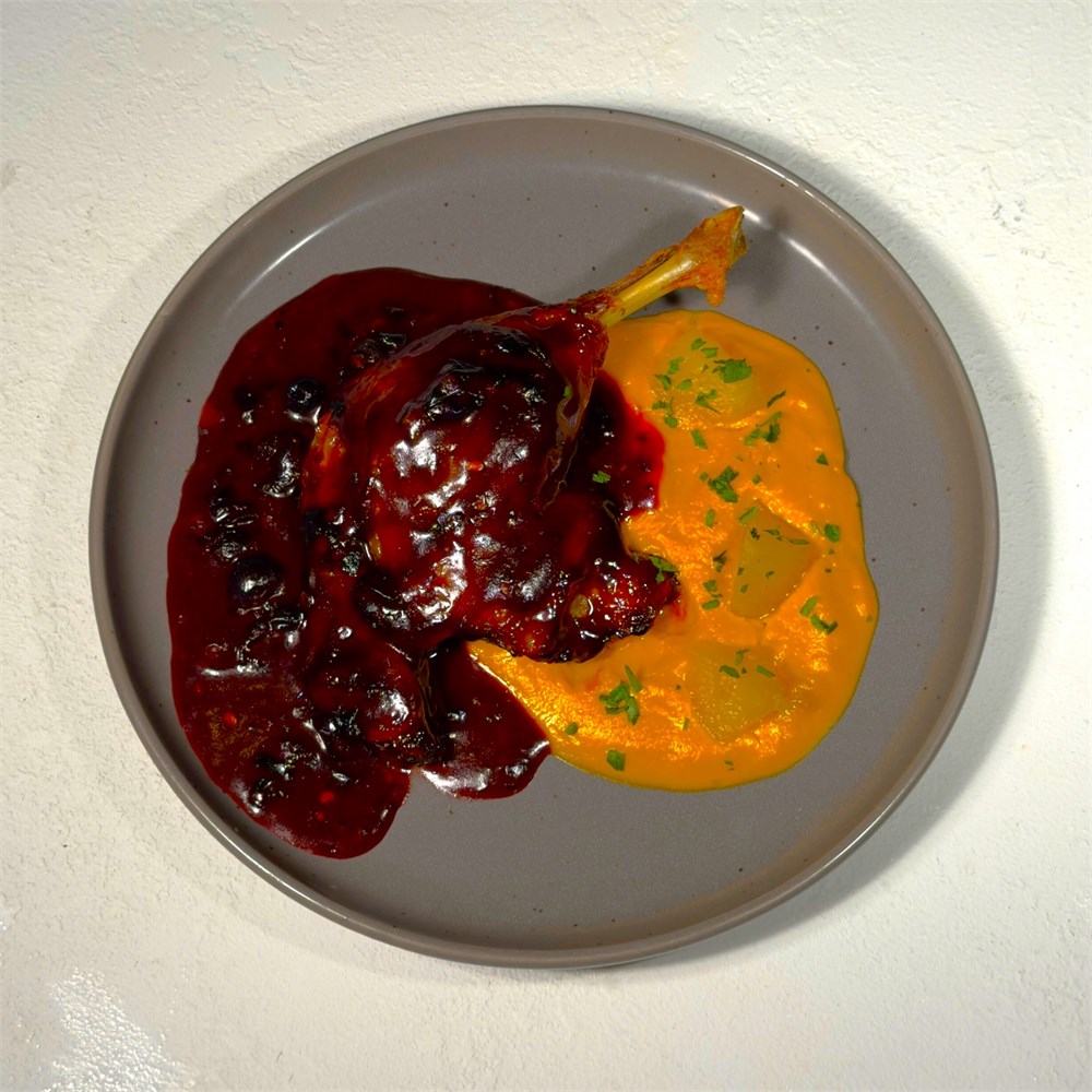 утиная ножка, морковно-имбирное пюре, яблоко, смородина, соус перечный